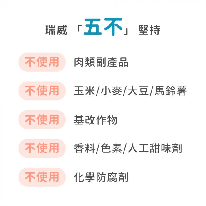 瑞威寵糧中約95%左右的原料經水解程序。其中,將較可能引起過敏反應的動物性蛋白會水解至五千道耳吞以下,免疫細胞對小分子蛋白比較友善,較不容易發動攻擊、引起過敏反應。