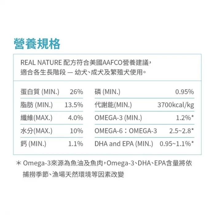 ▹ 本產品營養標示項目符合美國AAFCO營養建議,提供成幼犬維持每日所需之營養標準