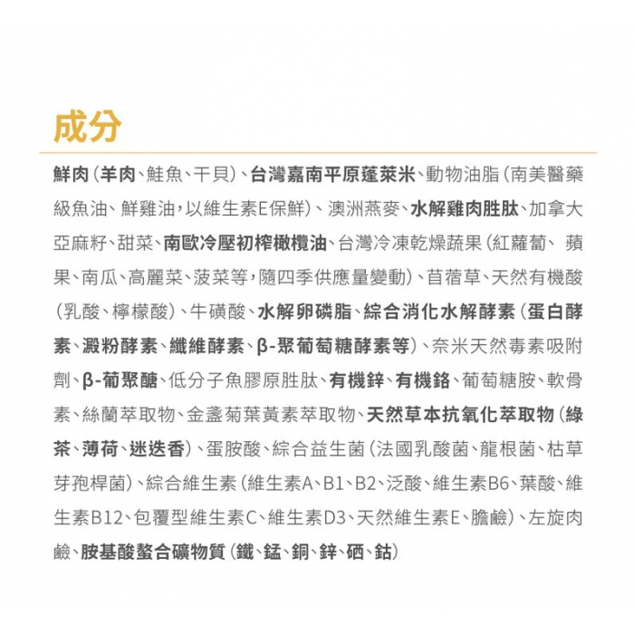 全配方中添加了水解雞肉胜肽,水解雞肉胜肽是極小分子的蛋白,是低敏的成分,不易引發過敏反應。