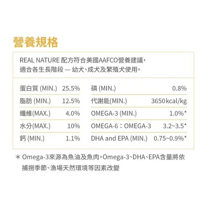 ▹ 本產品營養標示項目符合美國AAFCO營養建議,提供成幼犬維持每日所需之營養標準