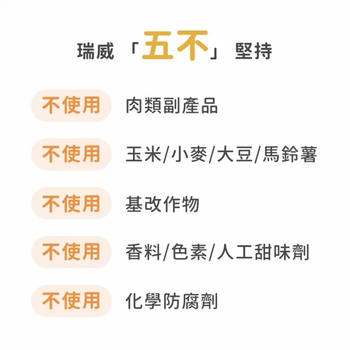 瑞威寵糧中約95%左右的原料經水解程序。其中,將較可能引起過敏反應的動物性蛋白會水解至五千道耳吞以下,免疫細胞對小分子蛋白比較友善,較不容易發動攻擊、引起過敏反應。