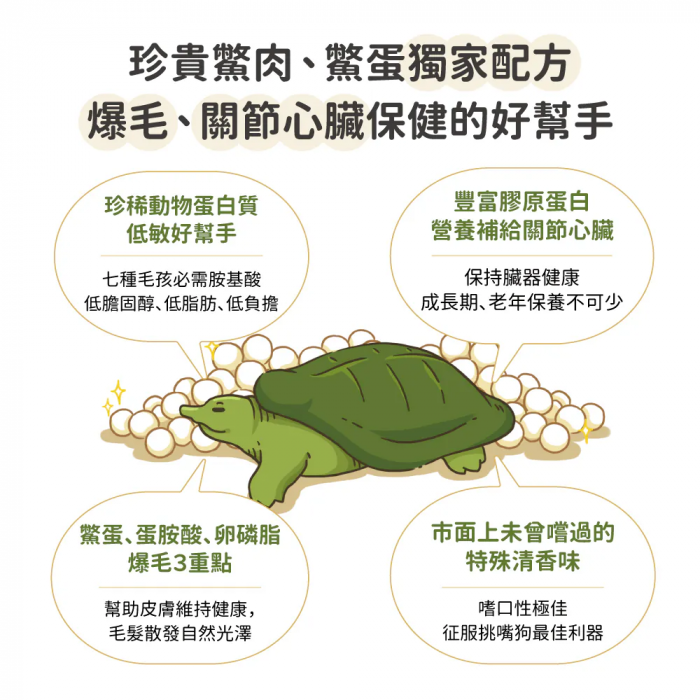 ✦ 78%鮮肉比例,獨家台灣養殖鱉低敏優異蛋白質