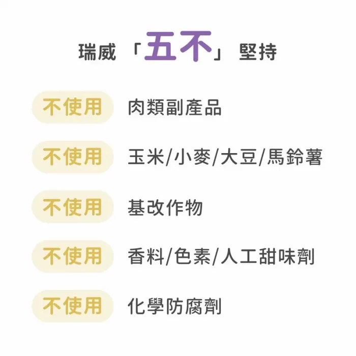 瑞威寵糧中約95%左右的原料經水解程序。其中,將較可能引起過敏反應的動物性蛋白會水解至五千道耳吞以下,免疫細胞對小分子蛋白比較友善,較不容易發動攻擊、引起過敏反應。