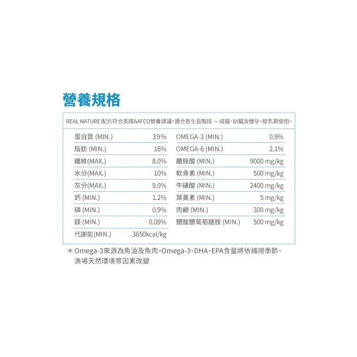 ▹ 優先推薦 皮膚敏感 或 毛色不均、糾結乾癟 的全齡貓▹ 本配方營養標示項目符合美國AAFCO營養建議,提供成幼貓維持每日所需之營養標準。
