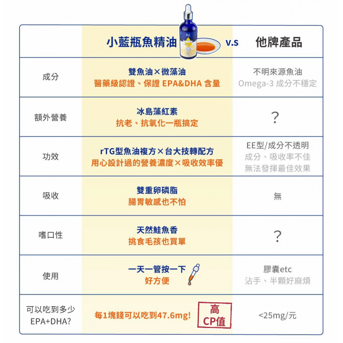 2. 市售少數保證DPA含量之寵物魚油,DPA被發現可幫助心血管保健、維持體態。