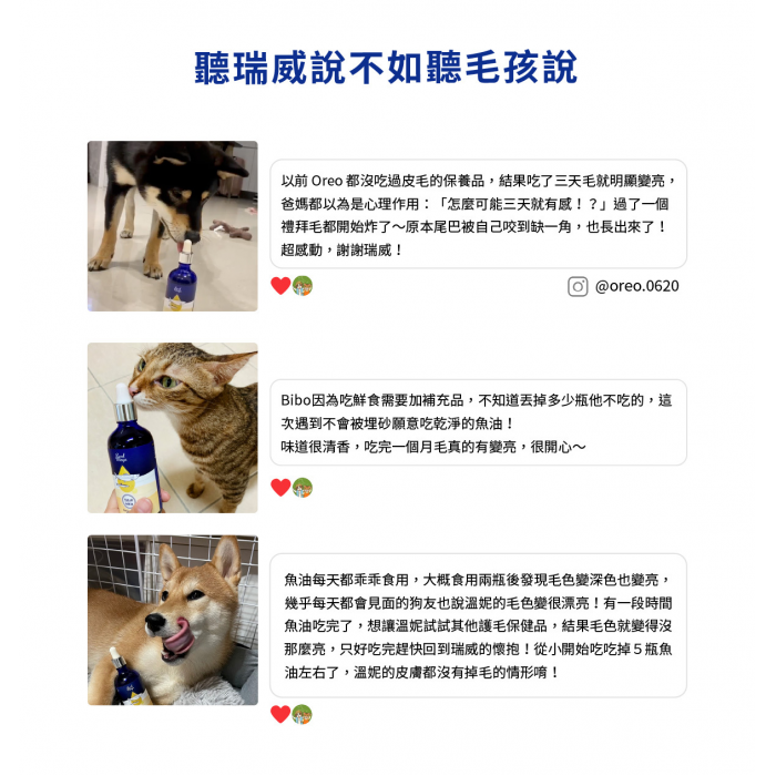 1. 使用三種油複方:雙魚油+國立臺灣大學技轉藻油,提供充足EPA+DHA基底,調和比例適合亞熱帶犬貓。