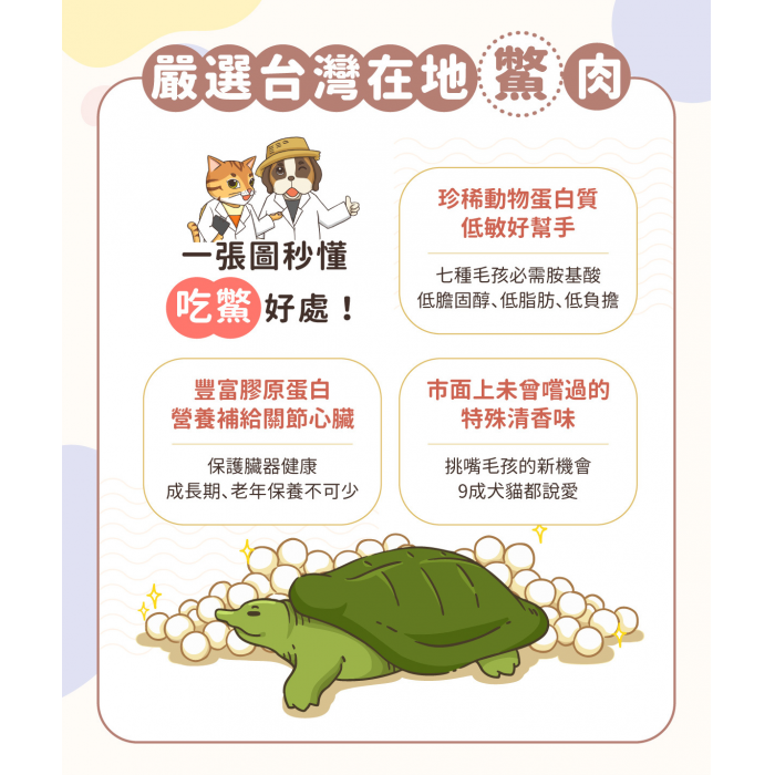 鱉肉泥 15g × 4小包 $32.00 會員價 $29.00 嚴選台灣養殖鱉,獨特鱉肉清香,吃過的犬貓都說愛! Real Power 鱉肉泥配方選擇 (紫色) 情緒紓壓 (黃色) 爆毛護膚 (紅色) 口腔保健 - + 添加至購物車 立即購買 Description Reviews
