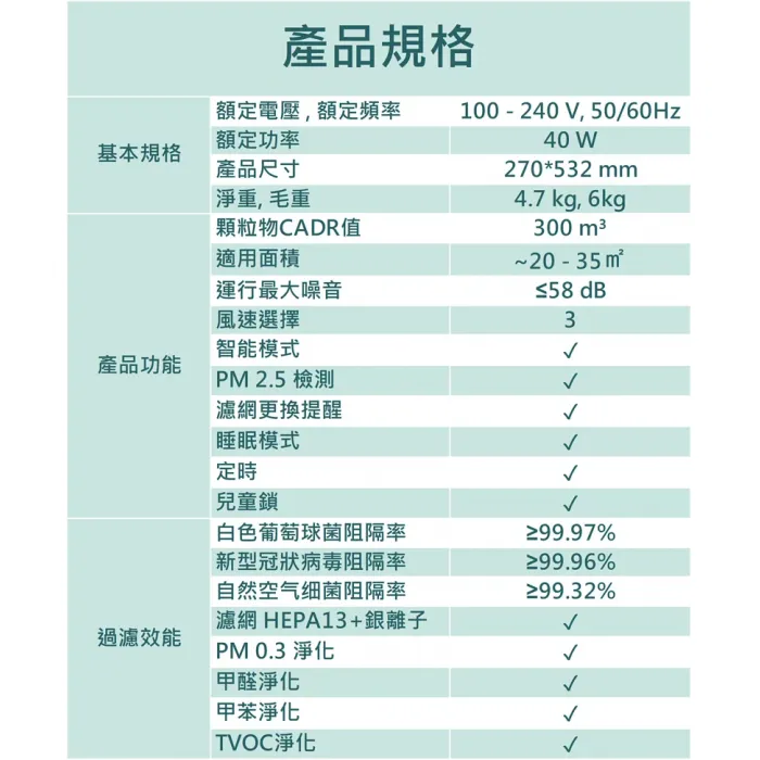 - 採用HEPA13+銀離子濾芯 (醫療級別),能過濾>0.3微米的懸浮微粒